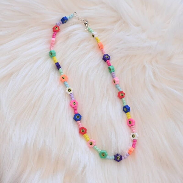 Laat je outfit stralen met deze speelse parelketting vol vrolijke bloemen. Lichtgewicht, comfortabel en perfect om je zomerse look af te maken.