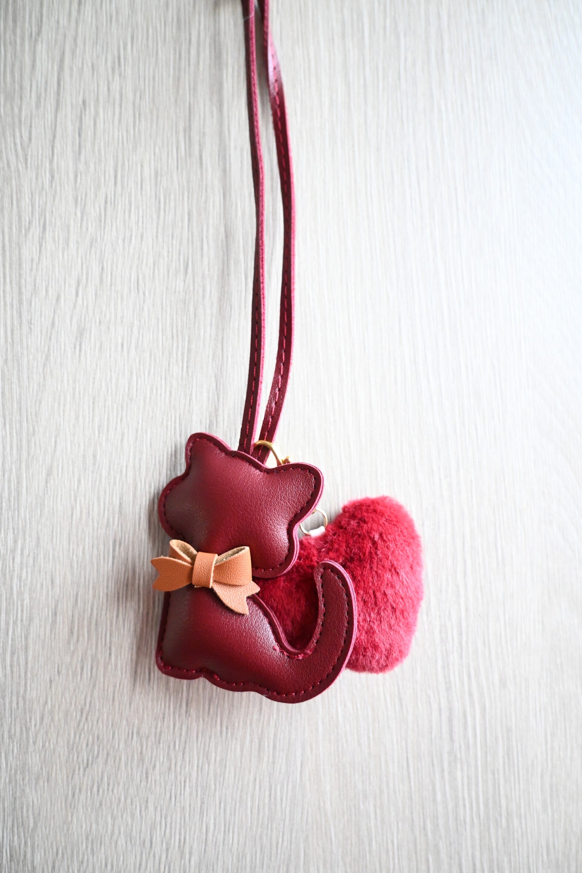 Kat Bag Charm – Lederen Tashanger met hartje pompom - Bordeaux/rood