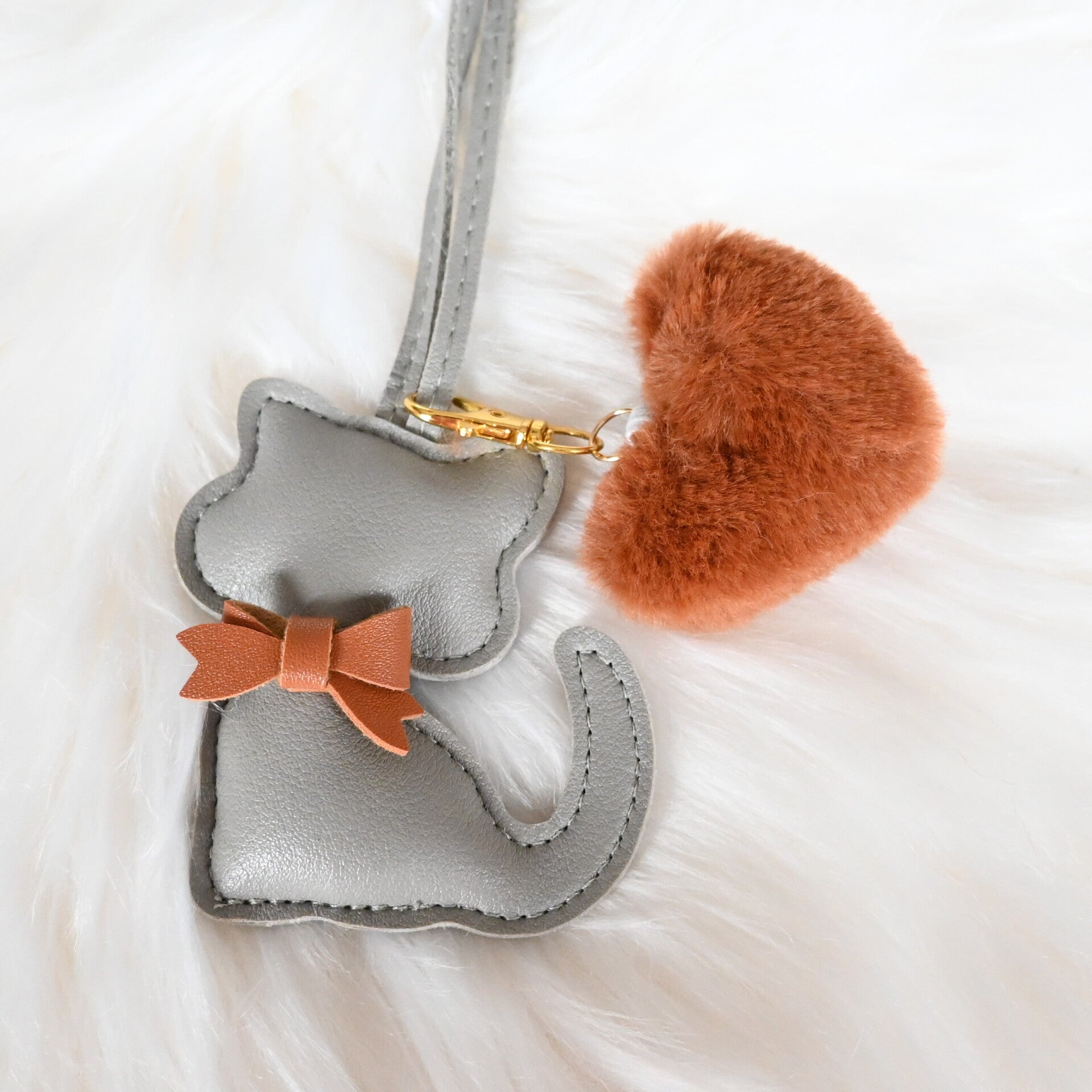 Kat Bag Charm – Lederen Tashanger met hartje pompom - Grijs/bruin