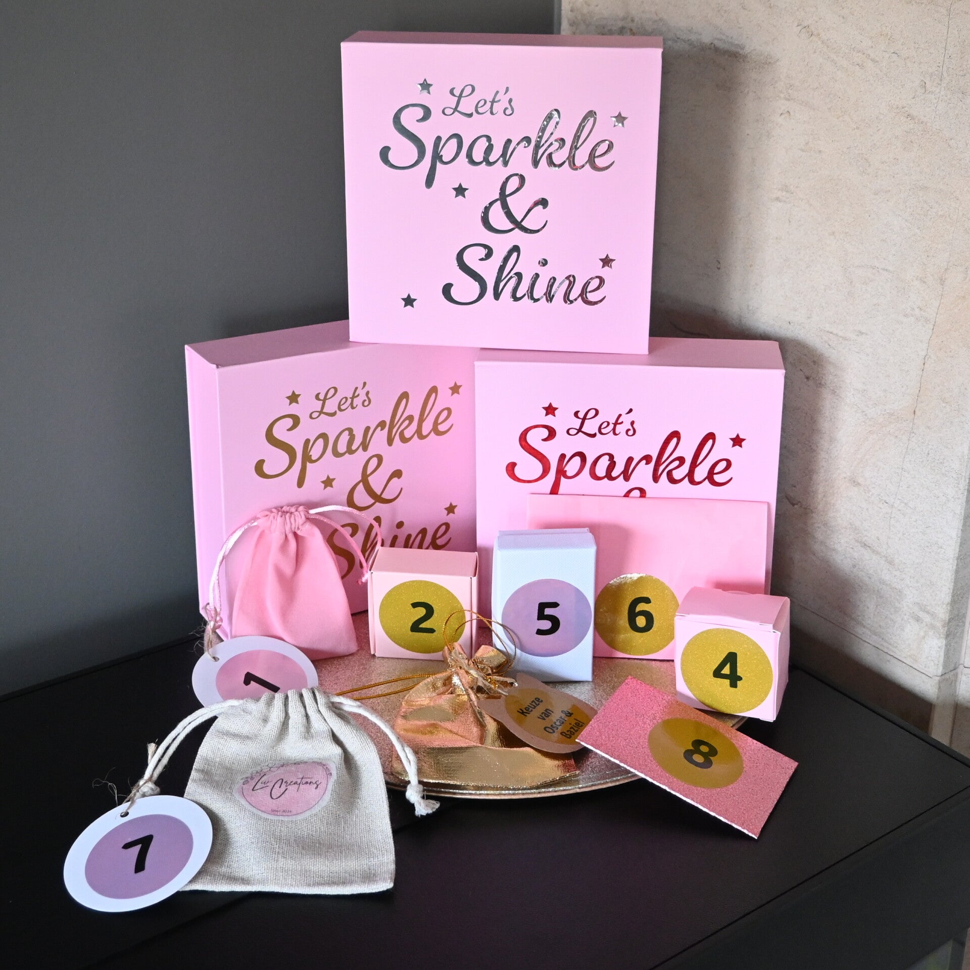 Elke box wordt met zorg samengesteld in de typische Liv Creations-stijl — zacht, elegant en uniek. Geen twee boxen zijn hetzelfde, maar allemaal brengen ze die herkenbare sparkle waar we zo van houden ✨